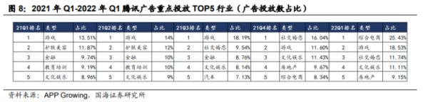 国海证券认为,腾讯广告业务虽短期承压,但长期基本面仍将回归正轨。朋友圈广告目前处于放量期,将陆续开放第五条库存,中长期视频号、搜一搜等新广告位将开辟新增量。根据 APP Growing 数据,2022Q1 腾讯广告平台 TOP5 投放行业为综合电商(25%)、游戏(19%)、社交婚恋(12%)、文化娱乐(11%)、房地产(9%)。由于春节假期期间直播电商和大批量新发手游,综合电商和游戏行业的广告占比相较 Q4 明显上升。