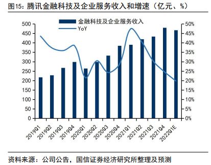金融科技业务和企业服务收入预计均维持增长,但增速同样可能放缓。国信证券预计2022Q1收入为468亿元,同比增长约20%。