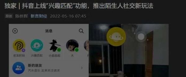 根据国内媒体《新言财经》报道,近日,抖音App在其“消息”页内的上方窗口中新增“兴趣匹配”功能,这项全新的陌生人社交玩法主打基于短视频内容的兴趣社交,可以根据用户正在观看的短视频内容匹配同看的网友进行“匿名聊天”“兴趣匹配一起看”和“语音聊天”等交互行为。