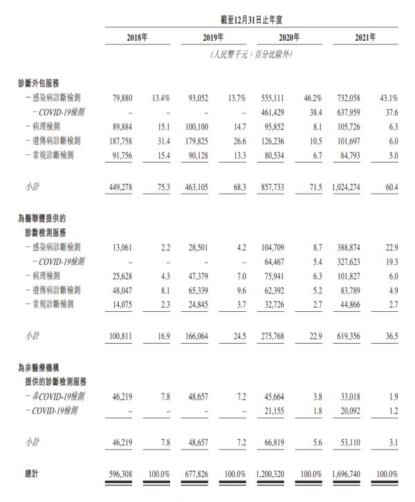 招股书显示,从2018年到2021年,该公司以核酸检测为主的感染病检测服务,营收占比从15.6%涨至66%,其余三项检测服务营收占比不断收缩。
