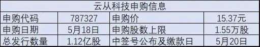 5月18日,作为“AI四小龙”之一的云从科技开启申购,根据上交所网下申购平台收到的154家网下投资者管理的4283个配售对象的初步询价报价信息,云从科技最终确认本次拟公开发行股票1.12亿股,申购价格为15.37元,单一账户申购上限为1.55万股,中签号将于5月20日公布。