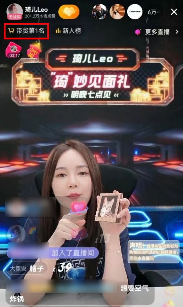 5 月 7 日晚,琦儿在抖音直播带货,不到 20 分钟,琦儿就登上了抖音带货榜第一名的位置。