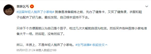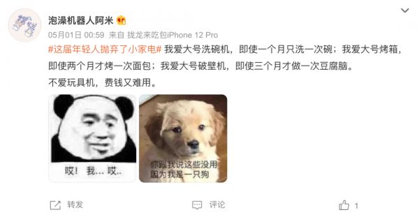 “别说年轻人了,我一个俩娃的家庭主妇也觉得所谓小家电没啥大用处,太占地方,利用率太低。当然,特别爱吃某一类食物,利用率高的还是可以考虑的,比如破壁机,可以解决早上豆浆,米糊等问题,可问题是人不可能一直都吃一样的东西吧!”