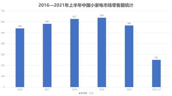 中商情报网的数据显示,2021上半年小家电零售额共计250.8亿元,同比下降8.6%,2020年全年这一数字为566亿元,以此推测2021年全年国内小家电行业的市场规模约为500-550亿元。