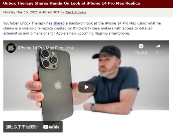 不过,产品信息终究只是一些文字而已,消费者们显然更希望看到实际的产品。根据外媒MacRumnors报道,近日,YouTube主播Unbox Therapy分享了对iPhone 14 系列产品的“上手体验”,为我们展示了由第三方苹果授权外壳制造商创建的一对一复制手机模型。