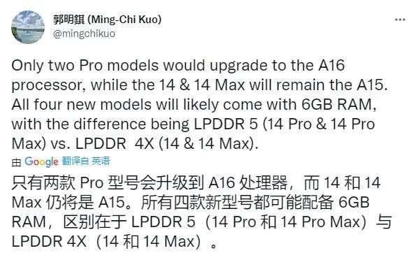 最后,让我们看看iPhone 14系列的配置信息。根据最新爆料,iPhone 14与iPhone 14 Max仍然采用iPhone 13系列的A15处理器,并且采用6GB LPDDR4x运行内存;iPhone 14 Pro与iPhone 14 Pro Max将搭载全新的A16处理器,并且采用6GB LPDDR5运行内存。