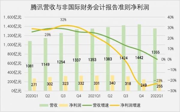 5月18日,腾讯发布2022年第一季度财报,数据显示一季度营收1355亿元,增速与去年基本持平。非国际财务会计报告准则下,净利润255亿元,同比下滑23%。