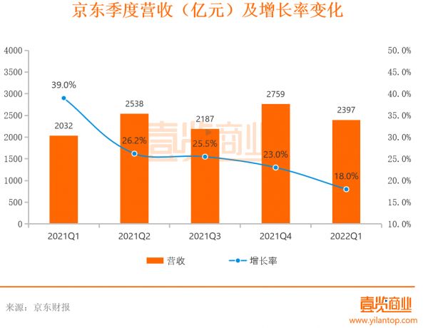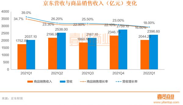 从财报数据看,对京东营收增速拖后腿的主要是商品销售收入上,一季度京东商品销售收入2044亿元,同比增长16.6%,低于整个集团的18%。