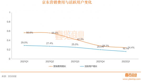 这相当让人忧心。数据显示,在经过了2021年用户高速增长后,京东的用户增速正在肉眼可见地放缓。季度内,京东过去12个月的活跃购买用户数达到5.805亿,而在去年四季度这一数字为5.697亿,环比增长仅为1.8%。这说明,京东在获取用户的成本越来越高,营销的效率越来越低。