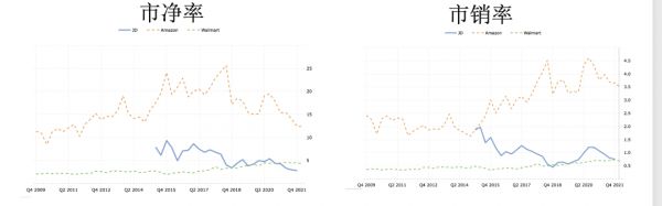 上图为京东,沃尔玛和亚马逊三家公司的市净率和市销率的对比情况,可以直观看到,自上市之后京东的市销率就不断下调,从与亚马逊同一水平不断向沃尔玛靠拢。我们也知道,市销率本就是为成长性公司所设置的,此模型更侧重于企业的增速。