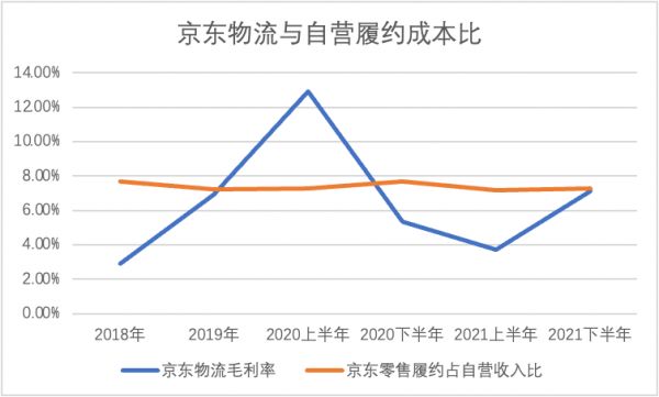 在上图中可以看到,从2020年之后京东物流毛利率就处于下行通道,这就降低了零售业务的履约成本负担,换言之,京东零售业务在过去很长一段时间的优化是以物流业务的让利来实现的,亦由于京东自身以及其整个生态对物流业务占比巨大,也就使得物流业务无法实现市场化定价,京东物流的毛利大幅低于同类企业。