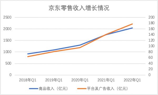 2022年Q1自营类收入同比增长16.6%,当期全国实物类电商同比增长8.8%,同周期内2021和2020年京东的平均增速为27%,当期全国网上零售两年平均增速为15.4%。
