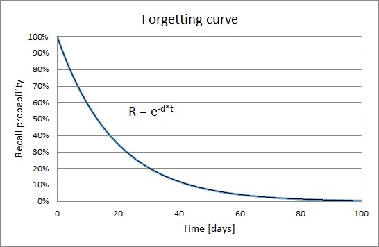 遗忘曲线显示了随着时间的推移,你会忘记多少东西。它表明了随着时间的推移,你回忆事物的能力是如何自然下降的。这是一个许多人从未意识到的重要事实:如果你只看到信息一次,很可能在三个月后就完全忘记了。无论演讲、书籍、企业培训或在线课程多么精彩,除非你打破遗忘曲线,否则就会忘记大部分内容。