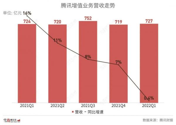 包含着社交、游戏的增值业务板块依然是腾讯最大的现金牛,Q1营收727亿元,在总营收中占比近54%。不过从整体增长来看已开始“原地踏步”,同比微增0.4%。