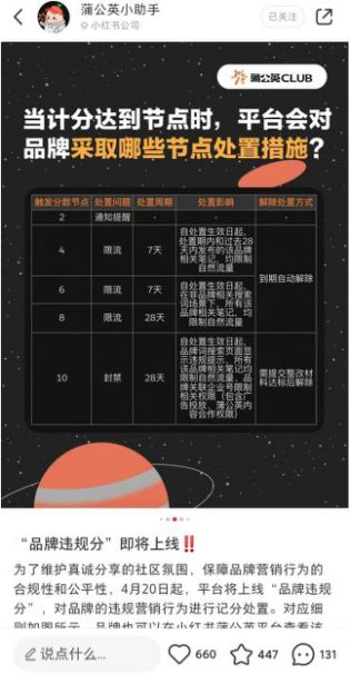 今年4月,小红书上线“品牌违规分”机制,用更加透明、可视的产品化手段,按照严重性不同,对品牌在站内的营销行为进行不同程度的处理。
