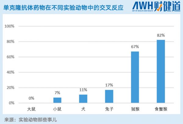 2019年一项针对39个单克隆抗体药物在实验动物中产生交叉反应的实验显示,大鼠完全没有交叉反应,兔子、狗、小鼠的数据都在20%以下,绒猴的交叉反应为67%,食蟹猴的交叉反应是最高的,可达82%。可见,实验猴在生物大分子实验中是不可替代的。