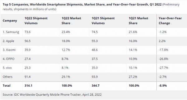 根据第三方市场调研机构IDC数据,2022年Q1全球智能手机出货量同比下降 8.9%,连续三季度下滑,降至3.141亿部。其中,小米全球出货量为3990万部,以12.7%的市场份额保住第三,但是出货量同比下降17.8%,市场份额下降1.4个百分比。