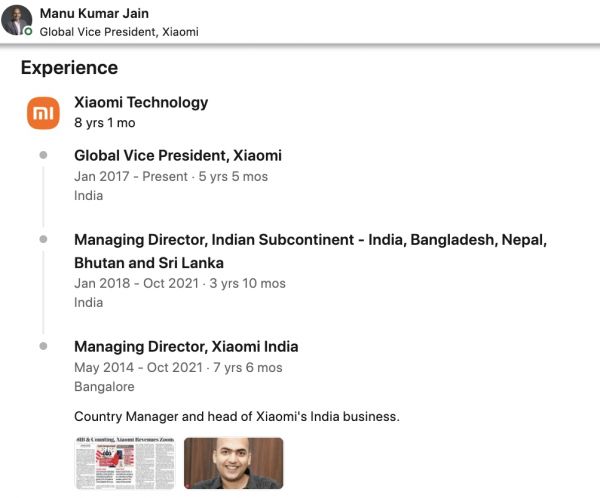 小米印度内部也出现人事变动。据印度本地媒体India Today报道,小米公司全球副总裁、印度业务的掌舵者马努·库马尔·贾恩(Manu Kumar Jain)被法院传唤,被要求配合公司外汇合规情况调查。一种猜测是,他目前已在迪拜工作生活,将不再执掌小米印度业务,小米与马努本人都未对该变动有明确表态,但是在马努的领英和Twitter资料中,目前都抹去了印度负责人身份,只留下全球副总裁的职位。