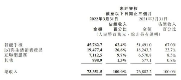 智能手机业务也成为小米三大主要业务线中,唯一出现收入同比下降的业务,当季收入458亿元,同比下滑11.1%。