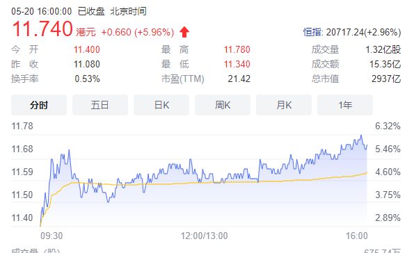 5月20日,小米股价大涨,截至收盘报收11.74港元,涨5.96%,总市值2937亿港元。