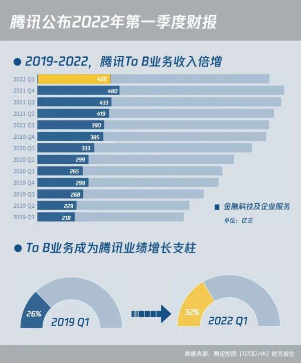 此次财报的重要看点是腾讯的To B业务,本季度腾讯To B业务单季收入为428亿元,占总营收32%,成为腾讯主要收入增长引擎。事实上,从2019年以来,腾讯To B业务收入一直保持着增长态势,目前已经实现倍增,业务占据的腾讯营收比例也逐年上升,从2019年Q1的25.5%提升到2022年Q1的32%。