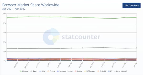 最新的浏览器市场份额,谷歌Chrome排名第一 图源:statcounter