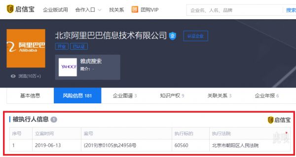 启信宝显示,6月13日,北京阿里巴巴信息技术有限公司新增被执行人信息 ,执行标的60560,案号为(2019)京0105执24958号,执行法院为北京市朝阳区人民法院。北京阿里巴巴信息技术有限公司成立于1998年10月14日,注册资本5亿6000万人民币,马云任法定代表人兼执行董事,谢世煌任监事。旗下产品为雅虎搜索。
