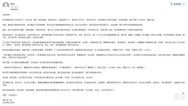 6月18日,快手CEO宿华发全员信宣布,快手从今天起开启守护未来的战斗模式,2020年春节前达到3亿日活。不过有网友表示,“战斗模式”“倾尽所有”等措辞,就是开启 996 的前兆。
