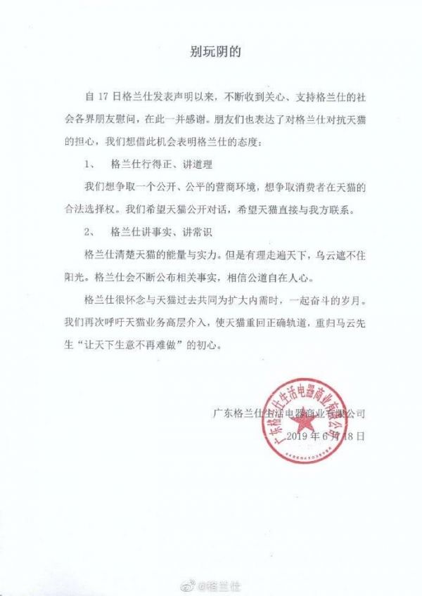 IT之家报道,6月17日,格兰仕在其公众号上发布《关于格兰仕在天猫平台出现搜索异常的声明》称,自5月28日格兰仕拜访拼多多以来,格兰仕在天猫平台的搜索端陆续出现异常,导致正常销售遭遇严重影响。18日下午,格兰仕再发公告斥责天猫“别玩阴的”,表示想争取一个公开、公平的营商环境,想争取消费者在天猫的合法选择权,希望天猫公开对话。