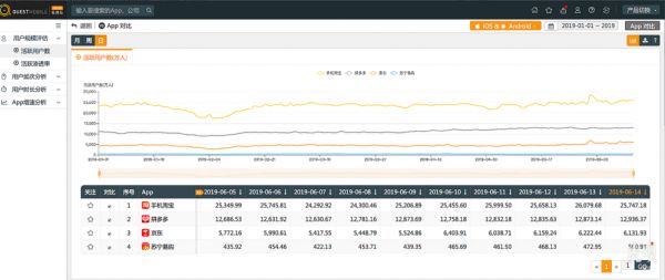 另根据QUESTMOBLE展示的618期间电商四大平台日活跃用户数据显示,手机淘宝大促期间的日均活跃用户在2.5亿左右;拼多多日活跃用户约是手机淘宝的二分之一,日活在1.3亿左右;京东的日活跃用户约是拼多多的二分之一,日活在6000万左右;苏宁易购app日活跃用户约为京东的十分之一,日活在450万左右。