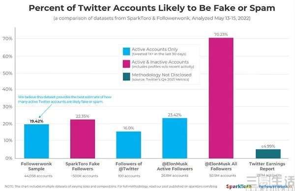 然而为了响应“大众的关切”,也有更专业的分析人员及受众研究软件参与了这项关于推特虚假账号的分析。在5月13日至5月15日,运营检测虚假粉丝工具的SparkToro与Twitter研究工具Followerwonk联手,公布自己的研究结果。