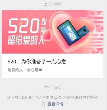 说回正题,尽管是 520,但对诺粉可算不上是啥好日子:就在昨天下午,微信公众号“诺基亚手机”已正式更名为“赫名迪科技有限公司”。