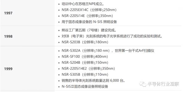 到了1999年,除了推出世界第一台干式ArF扫描仪NSR-S302A(分辨率≦180 nm)外,尼康还推出了NSR-SF100(分辨率≦400nm);NSR-S204B(分辨率≦150nm);NSR-2205i14E2(分辨率≦350nm);NSR-S305B(分辨率≦110nm)四款设备,销售的半导体光刻系统数量达到 6,000 台。