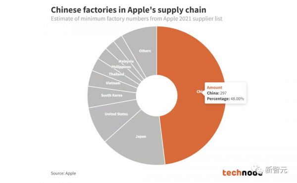 根据Technode数据,在苹果供应链所有工厂中,中国工厂数量占比大约在48%左右,接近一半,有297座。而在中国的江苏、广东和上海三地,共占苹果中国工厂总数的61%,占苹果全球总工厂数的三分之一。