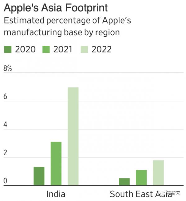 根据Counterpoint Research的估计,2021年,印度占苹果公司全球制造基地的3.1%,而2020年为1.3%,预计2022年将达到5%至7%。与占95.3%的中国相比,这个数字仍然是微不足道的。