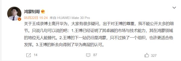 目前虽然没有官方证实,但王成录的微博ID以及微博的华为相关职位认证确实已经取消,可能已有一段时间。