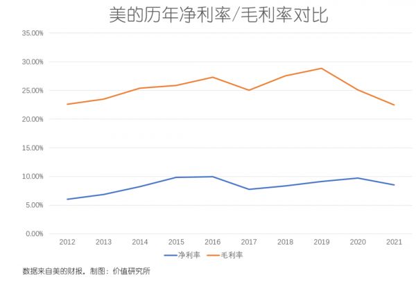 纵向对比就可以发现,美的的退步非常明显:2019和2020财年归母净利润同比分别增长了19.68%和12.44%。上一财年,美的毛利率和净利率分别为22.48%和8.5%,前者是2012年以来的最低水平,后者则是2015年以来的低谷——换句话说,美的的赚钱能力基本上相当于一夜回到十年前。