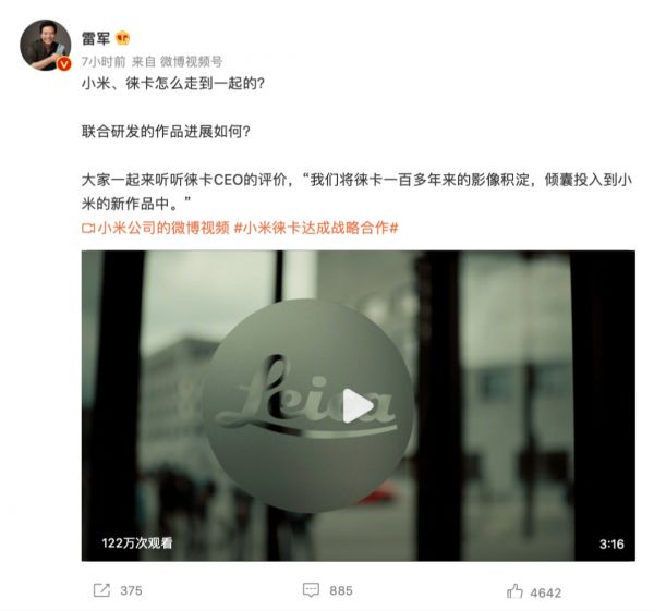 合作公布以后,小米董事长兼CEO雷军发文称:小米与徕卡认同彼此的追求与理念,欣赏彼此的优秀与行业影响力,此次合作将为小米的影像战略,提供强大的助力。双方的合作会从光学设计到调教审美取向,加入更多的创新技术,拥有产品哲学与影像理念,达到空前的深度碰撞与融合。