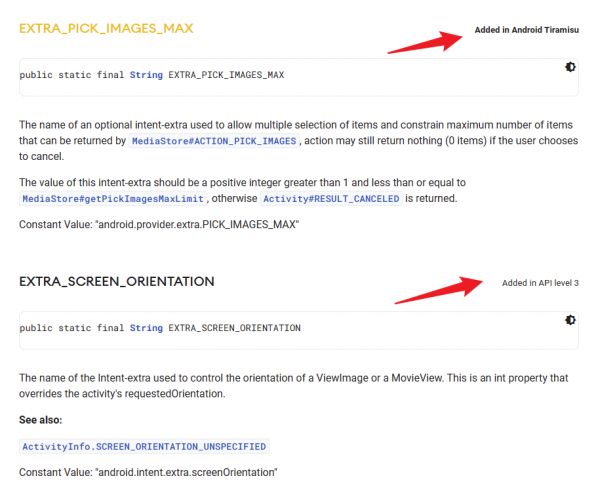 所以在 Android 开发者网站所列出的各种 API 接口、声明数值、字符串等信息旁,也都会有一行小字说明这个功能是在哪一个 API 级别中所加入的;在 Android 13 的介绍中,Google 也有一个专门的页面来说明目标 API 级别在 Android 13 及以上(另一种说法是「以 Android 13 或更高版本为目标平台」)的应用将受到哪些行为变更影响。