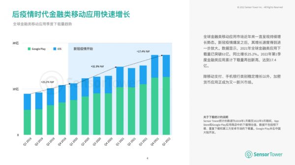 全球金融类移动应用市场近年来一直呈现持续增长势态。新冠疫情爆发之后,其增长速度得到进一步放大。数据显示,2021年全球金融类应用下载量已突破61亿,同比增长25.2%。2022年第1季度金融类应用累计下载量再创新高,达到17.4亿。