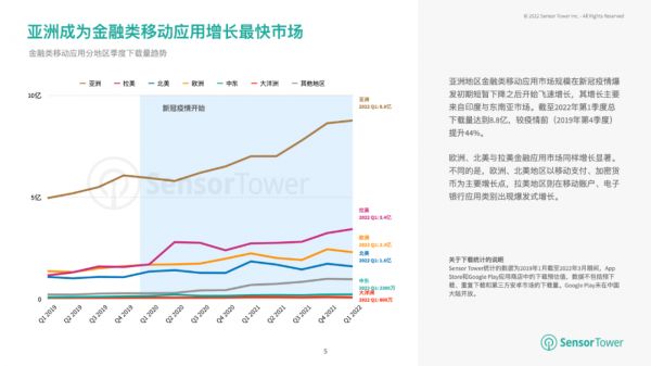 亚洲地区金融类移动应用市场规模在新冠疫情爆发初期短暂下降,之后开始飞速增长,其增长主要来自印度与东南亚市场。截至2022年第1季度总下载量达到8.8亿,较疫情前(2019年第4季度)提升44%。