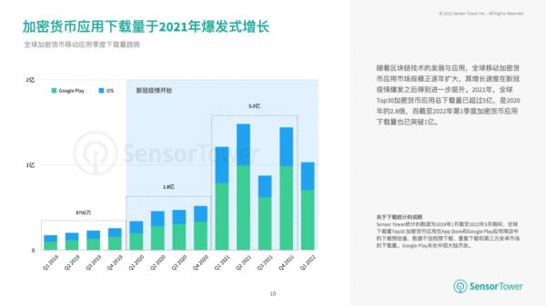 随着区块链技术的发展与应用,全球移动加密货币应用市场规模正逐年扩大,其增长速度在新冠疫情爆发之后得到进一步提升。2021年,全球Top30加密货币应用总下载量已超过5亿,是2020年的2.8倍,截至2022年第1季度加密货币应用下载量也已突破1亿。