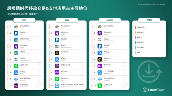 移动交易&支付应用仍然是最热门金融应用类别。2022年第1季度全球金融类应用下载量排行Top10中,7款均属于该类别。值得一提的是,《Google Pay》自2018年起一直稳坐全球金融类应用下载榜首位。此外,加密货币应用在2021年表现亮眼,共5款产品闯入下载榜前20,其中《Binance》与《Pi Network》分别排名第5、第7位。