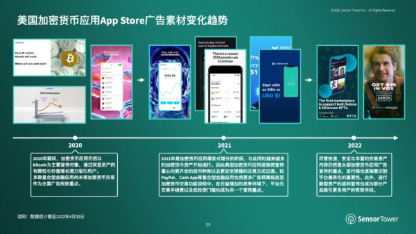 2021年是加密货币应用爆发式增长的阶段,与此同时越来越多的加密货币资产开始流行。因此,典型加密货币应用逐渐将宣传重心向更齐全的货币种类、更安全便捷的交易方式过渡。如《PayPal》、《Cash App》等复合型金融应用也将更多广告预算投放至加密货币交易功能说明中。在日益激烈的竞争环境下,平台无交易手续费以及低投资门槛也成为另一个宣传重点。