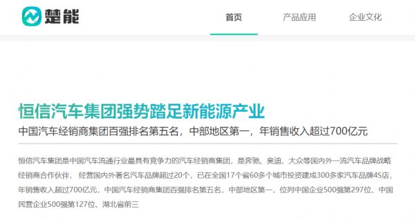相比于楚能新能源的籍籍无名,恒信汽车集团在行业内和区域内知名度较高,它是中国汽车经销商集团百强排名第五名,中部地区第一,位列中国企业500强第297位、中国民营企业500强第127位、湖北省前三。