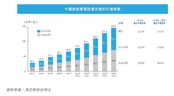 根据弗若斯特沙利文的报告,预计到 2026年,中国K-12学生人数将为224.3百万人,其中161.5百万人(或72%)位于三线及以下城市。目前国内智能学习设备市场总规模达659亿元,其预计2021年到2026年该市场整体复合年均增速为17.1%,To C部分复合年增长率为17.6%。