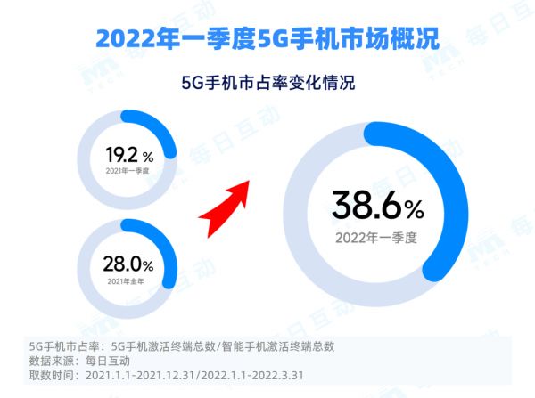 每日互动数据显示,2022年一季度,5G手机在智能手机市场的占有率持续增长至38.6%,同比增长1倍多,较2021年全年28.0%的市占率增长超30%。