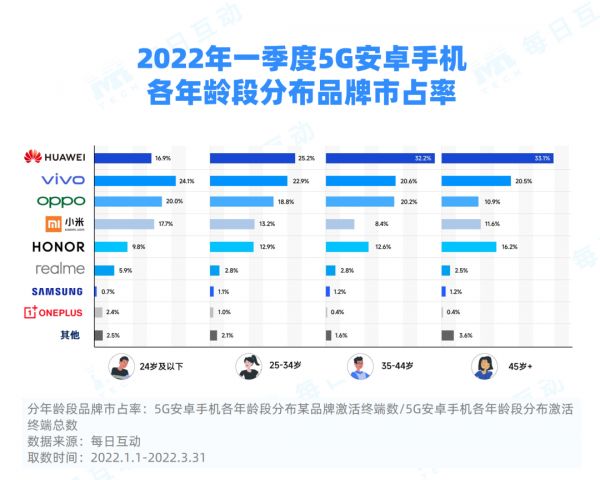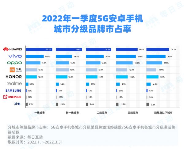通过春节促销季的拉动,截至2022年一季度末,5G手机市场格局也发生了些许变化。