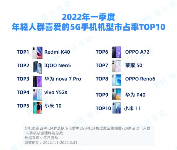 每日互动进一步关注了24岁及以下年轻人群喜爱的5G手机市占率排名。数据显示,Redmi K40、iQOO Neo5、华为nova 7 Pro、vivo Y52s、小米10是排名前五的热门机型。