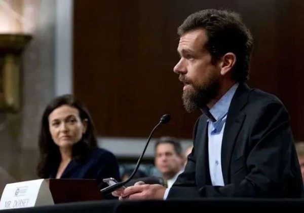 Jack Dorsey(图右)和Facebook COO 桑德伯格(图左)在2018年时接受美国国会关于外国势力是否影响社交媒体的质询
